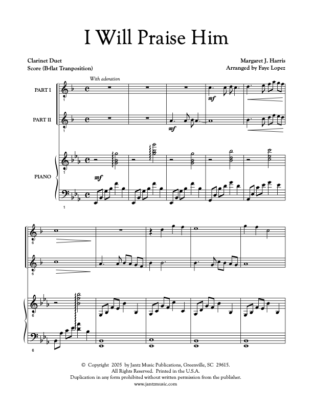 Includes the full score with piano accompaniment and separate duet parts for B-flat Clarinet I and II.