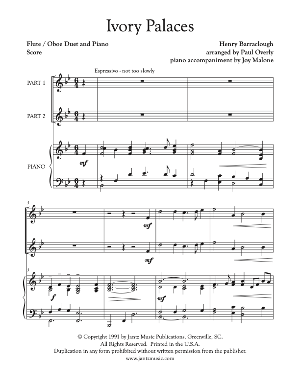 Includes the full score with piano accompaniment and separate duet parts for Flute I and Oboe II.