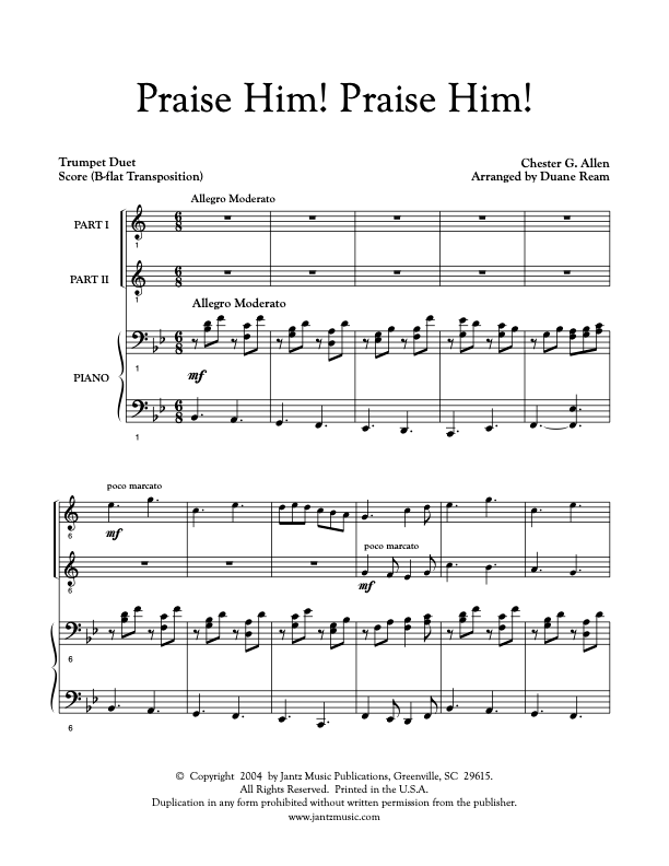 Trumpet duet with piano accompaniment. An uplifting arrangement by well-known arranger Duane Ream of this great hymn of praise – ‘Praise Him! Praise Him! Jesus, our blessed Redeemer!’