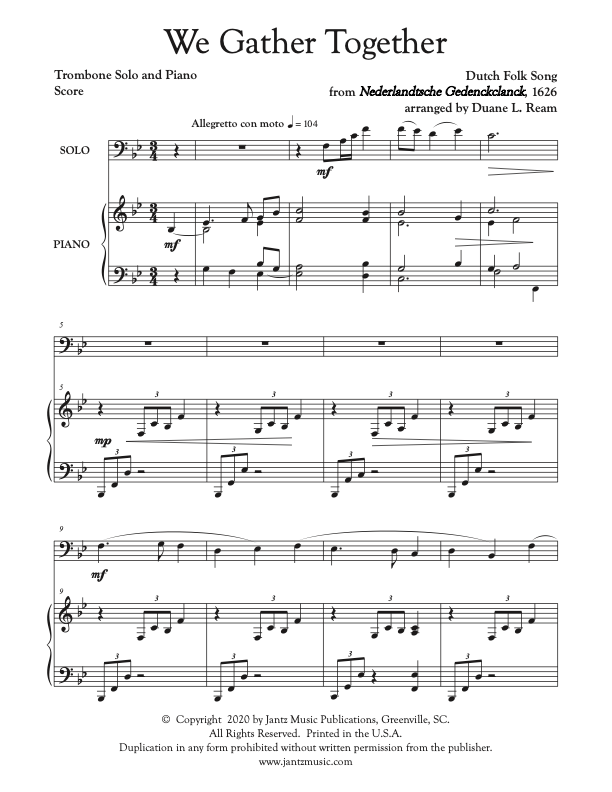 Trombone solo with piano accompaniment. A lovely arrangement of a Thanksgiving favorite.