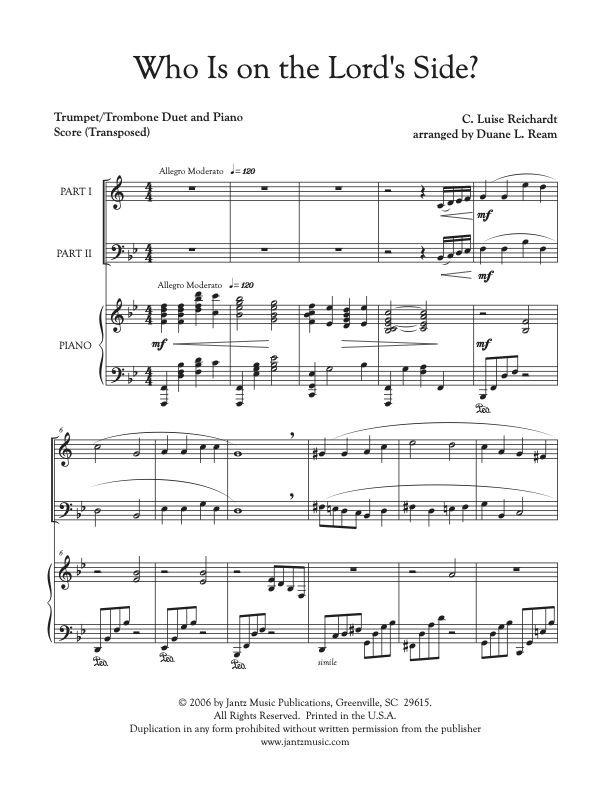 Includes the full transposed score with piano accompaniment and separate duet parts for B-flat Trumpet I and Trombone II.
